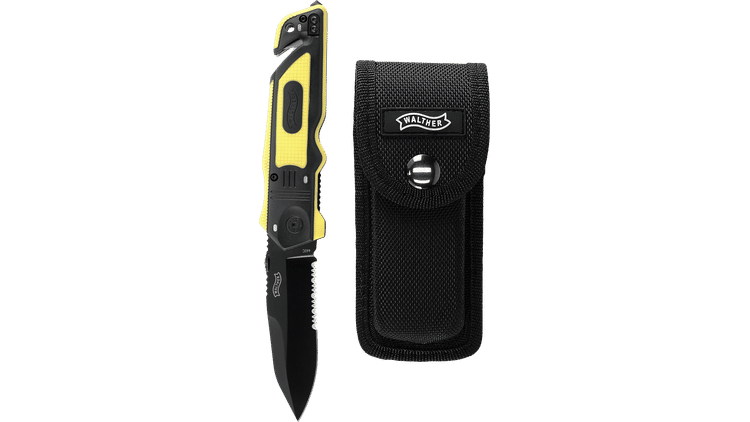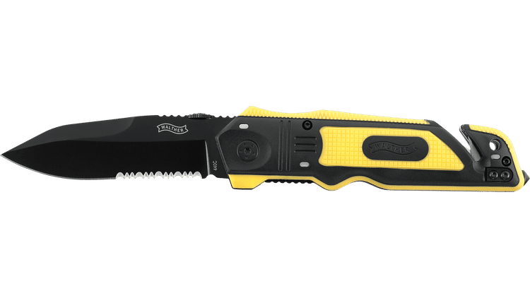 The Walther ERK (Emergency Rescue Knife) in yellow/black is a high-quality rescue knife designed for situations where speed, reliability and functionality can make all the difference. The 95 mm blade is made of durable 440C stainless steel and black coated for extra protection against wear and corrosion. The partial serration on the rear part of the blade makes it easy to quickly cut ropes, safety belts and webbing. The sturdy liner lock mechanism keeps the blade securely locked during use.