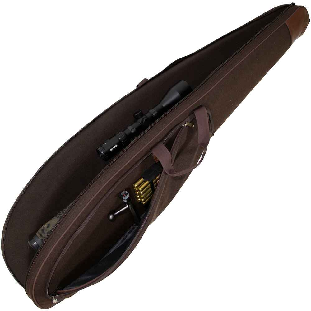 Classic long gun case Geir, made of hard-wearing lead with stylish imitation leather details. The interior is lined with foam and lined with soft fleece. The spacious outer compartment offers ample space for accessories such as ammunition, night vision equipment, silencers, etc. Both compartments of the case have double zips and can be closed with a padlock (not included). With carrying handles and backpack straps.